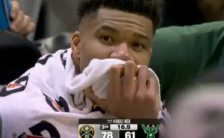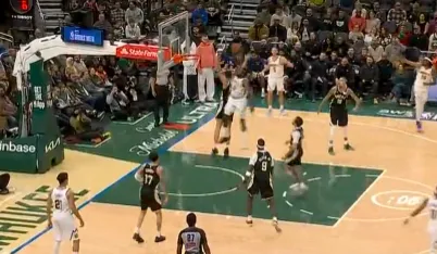 第三节比赛,哈达威里突外投连拿5分领先雄鹿17分,字母哥在场下眼神迷离。